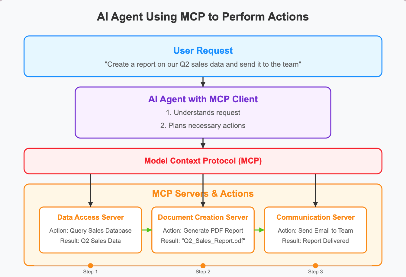 This means we are no longer chained to building separate API wrappers for every new function. Instead, we define capabilities that AI agents can leverage as modular building blocks for more complex workflows.. Below is a simple illustration of how an agent utilizes MCP to perform user task.