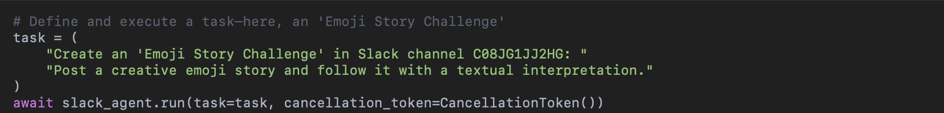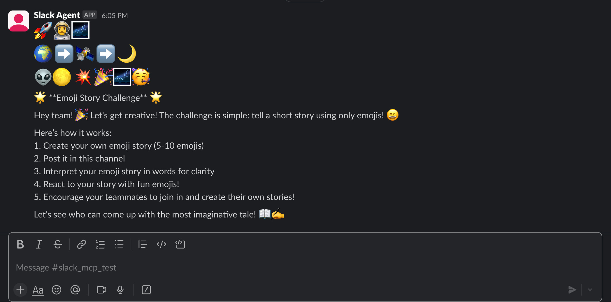 In my demo, I implemented an “Emoji Story Challenge.” Instead of posting a simple greeting, the agent: